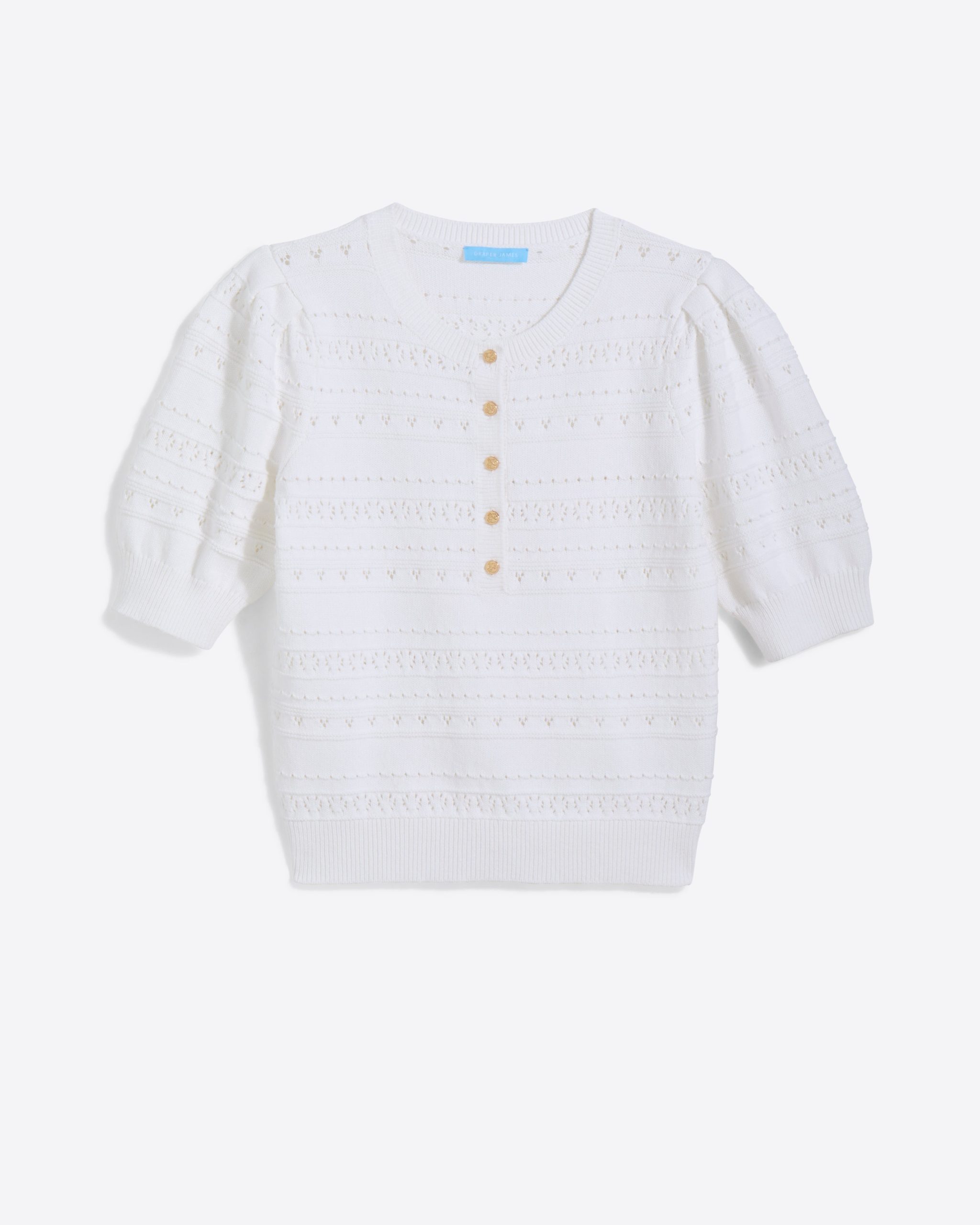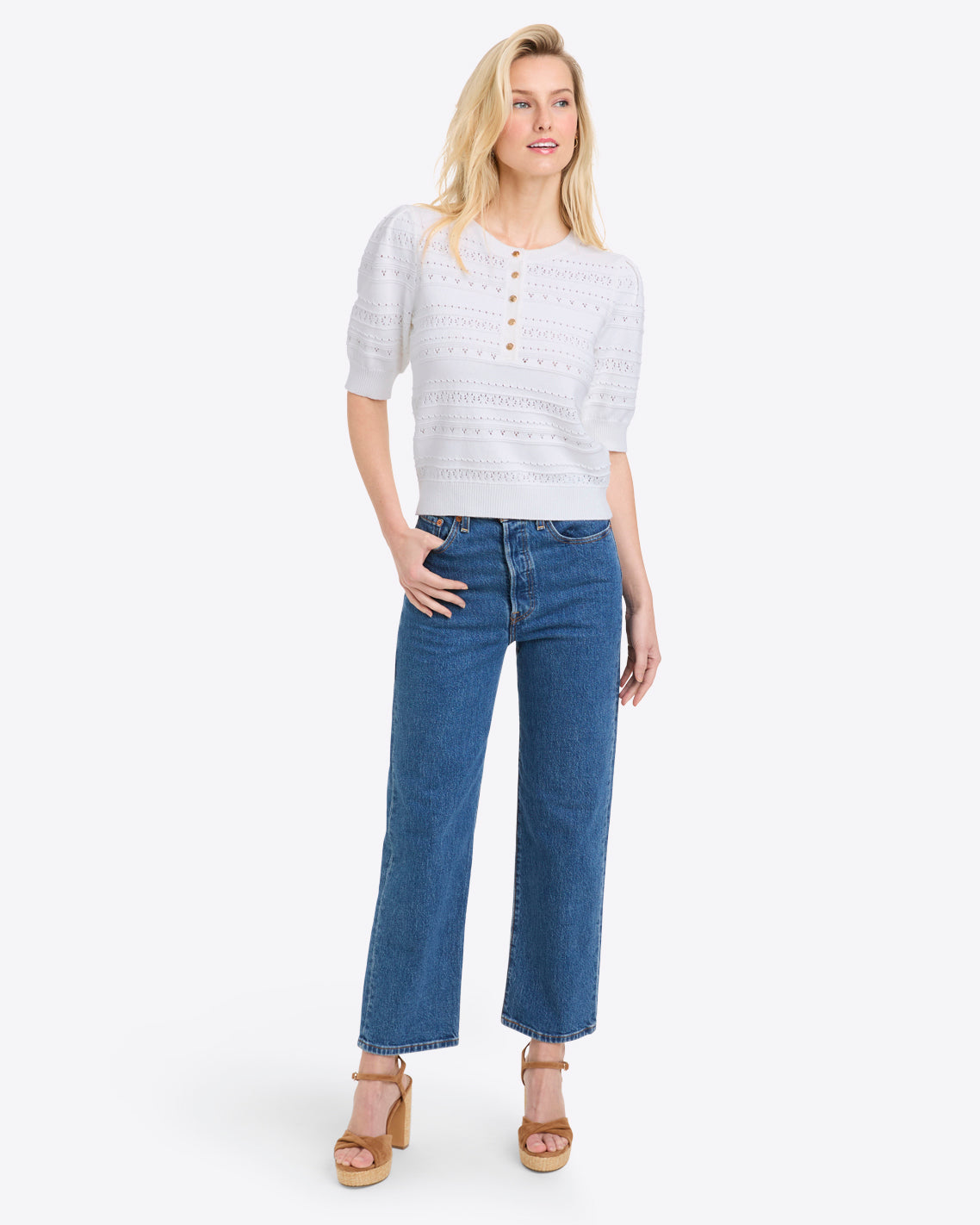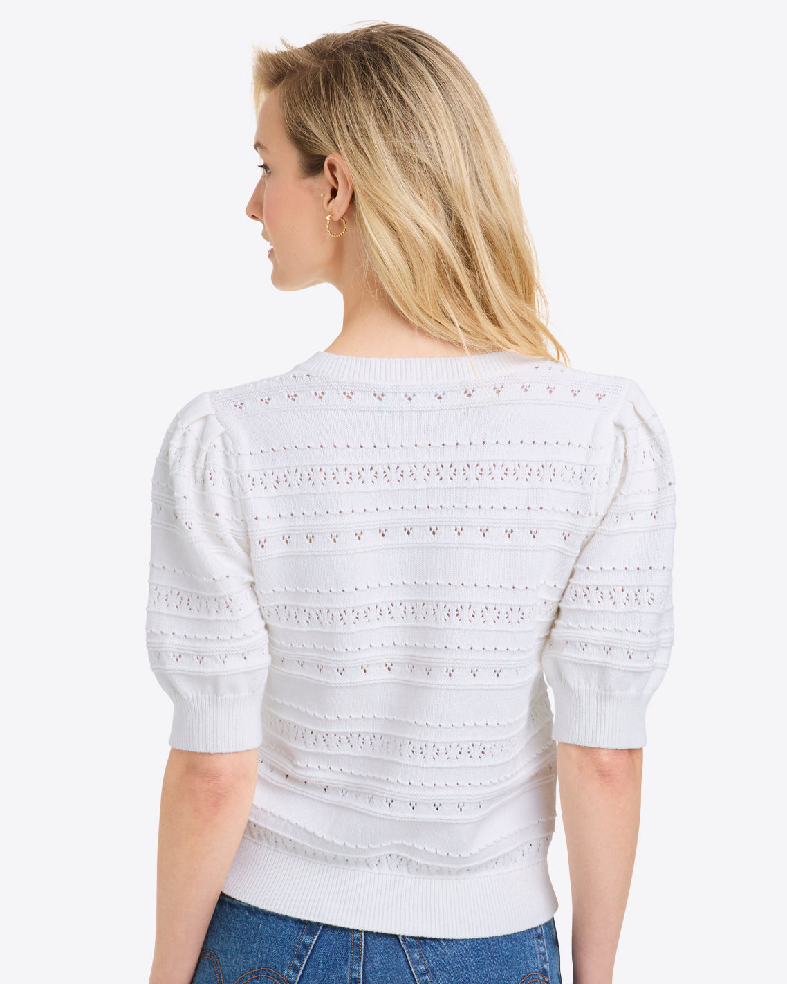 Sweater weather? Why not. Our 100% cotton pointelle Annabelle Short-Sleeve Sweater is lightweight enough to wear all spring and summer long.