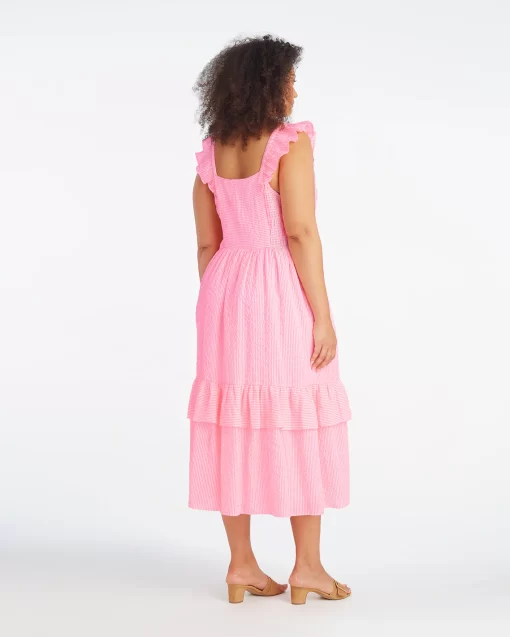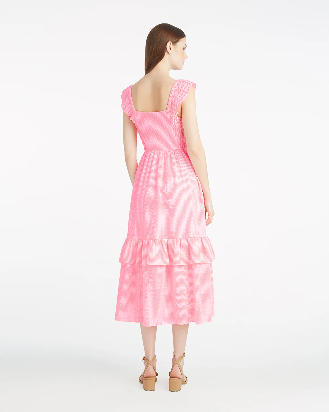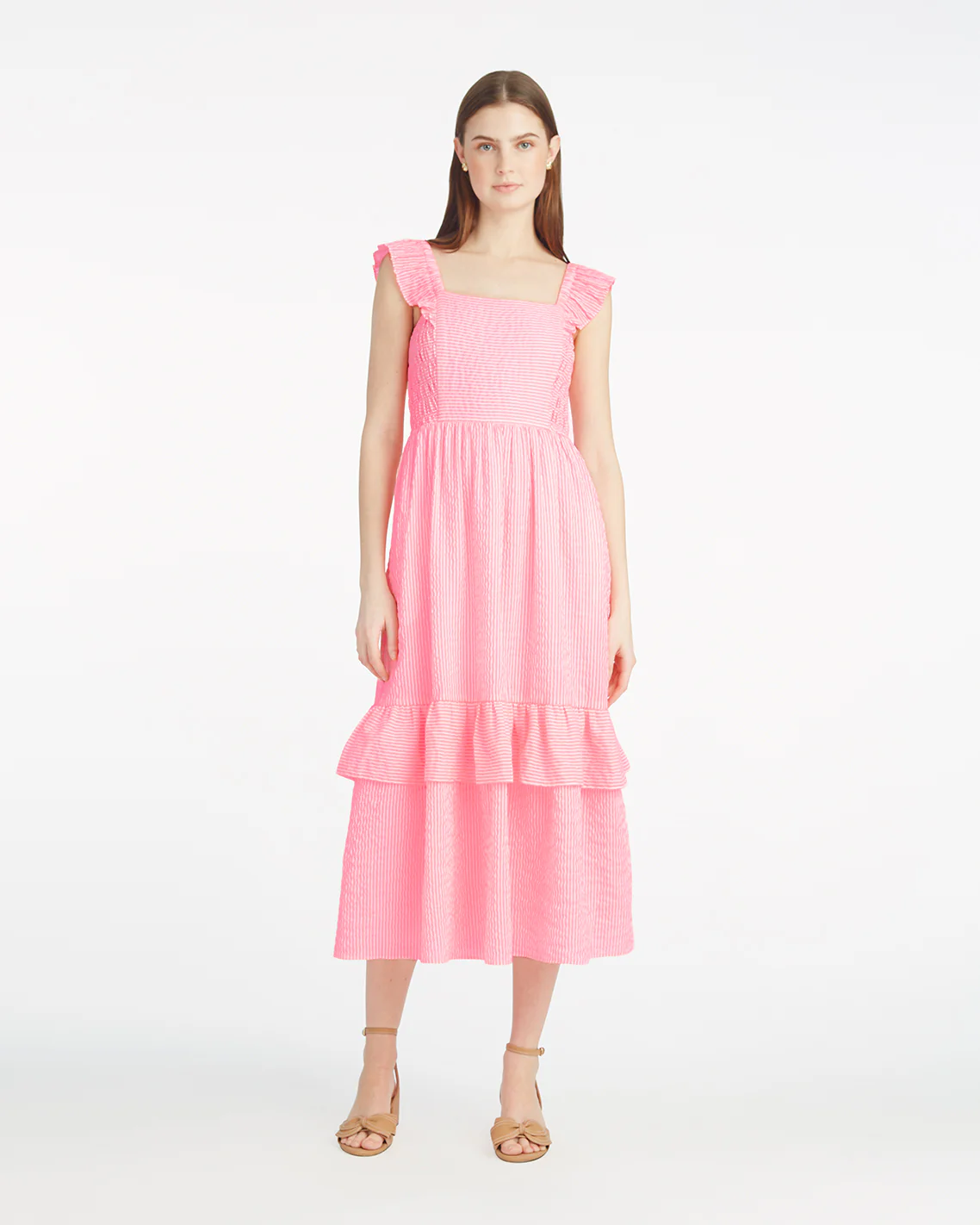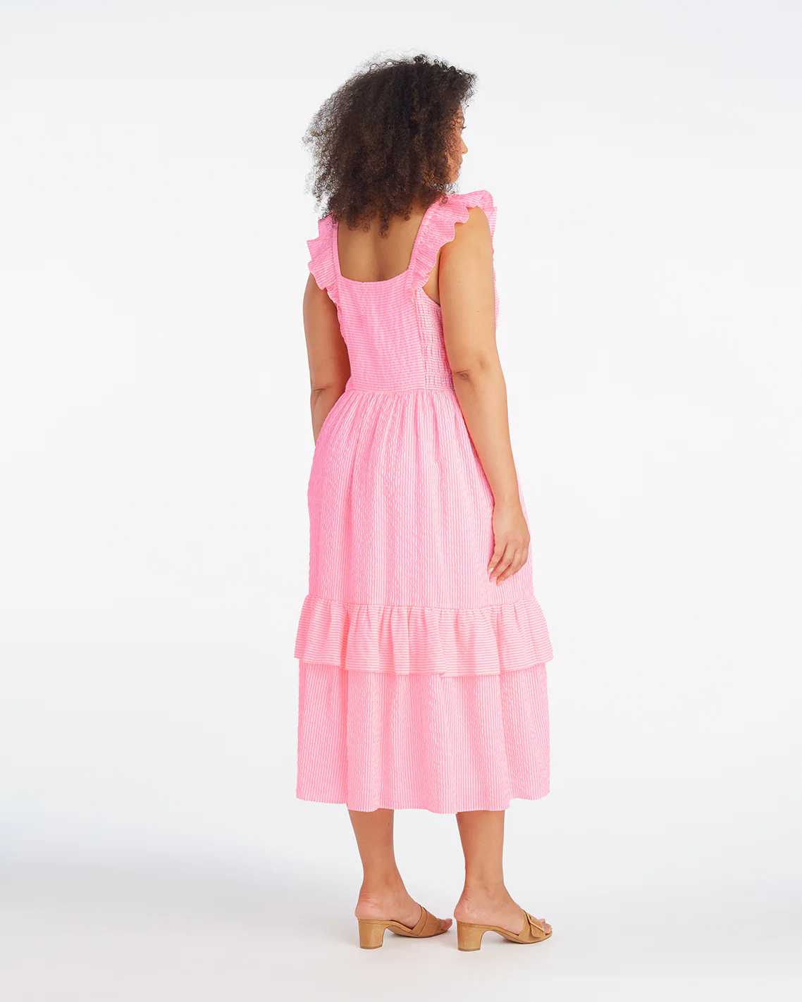 Bright and pretty in pink. Our Carrie Midi Dress in Pink Seersucker features shoulder ruffles, smocked side panels and a tiered skirt, for a look that’s as flattering as it is romantic. The length makes it a perfect match for your favorite high-heeled sandals, but you could wear it with slip-on sneakers, too, for a more casual vibe.