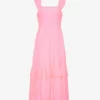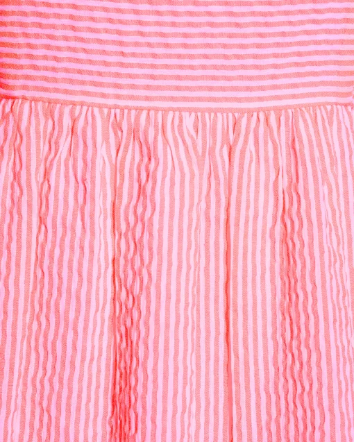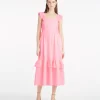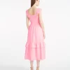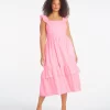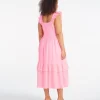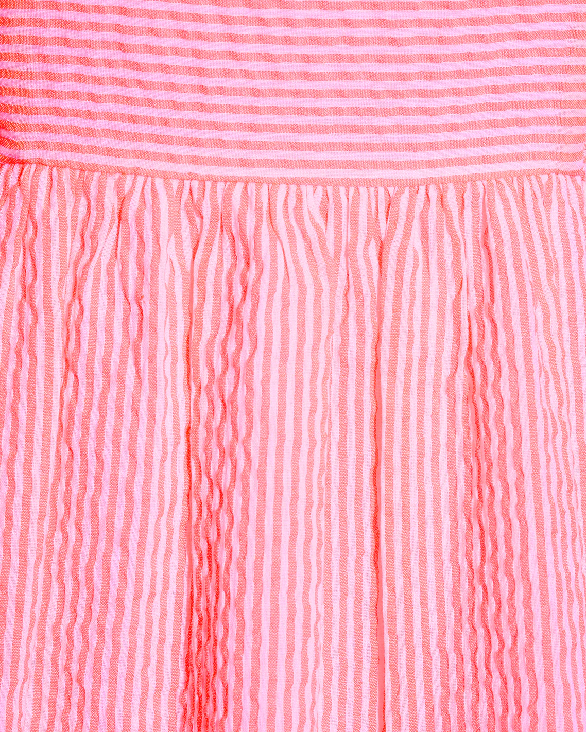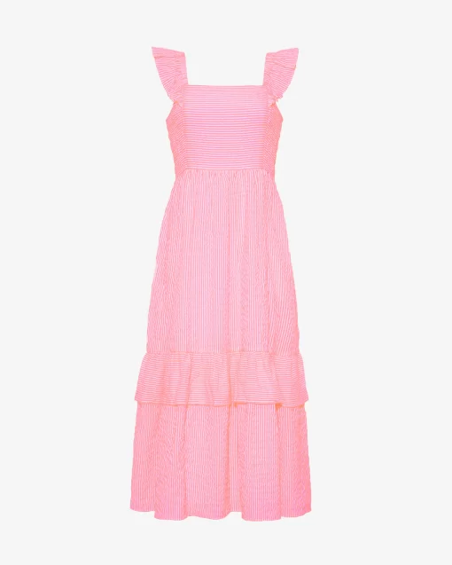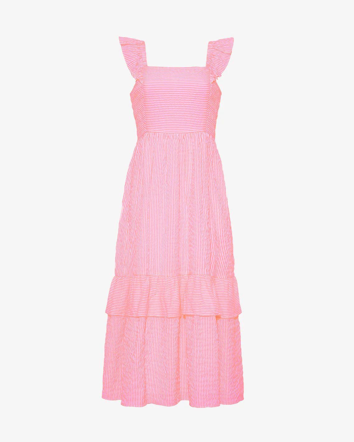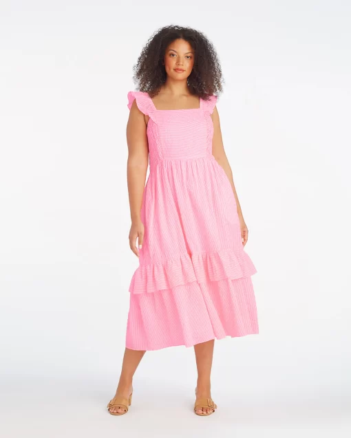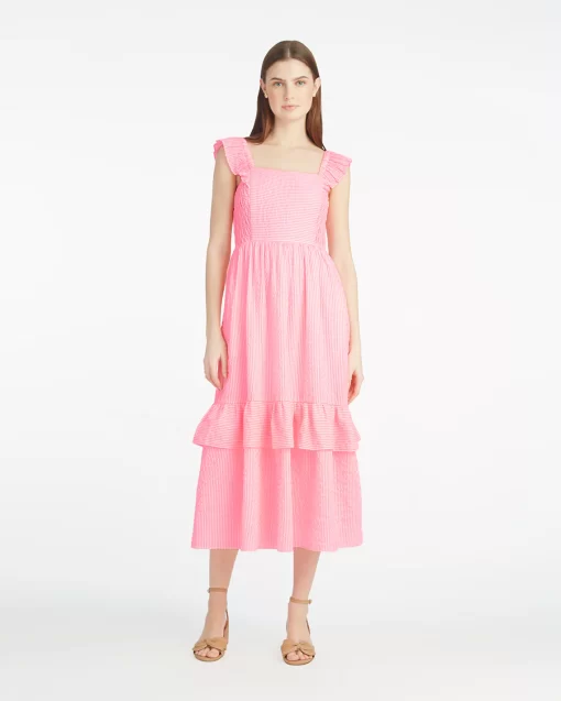 Bright and pretty in pink. Our Carrie Midi Dress in Pink Seersucker features shoulder ruffles, smocked side panels and a tiered skirt, for a look that’s as flattering as it is romantic. The length makes it a perfect match for your favorite high-heeled sandals, but you could wear it with slip-on sneakers, too, for a more casual vibe.