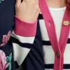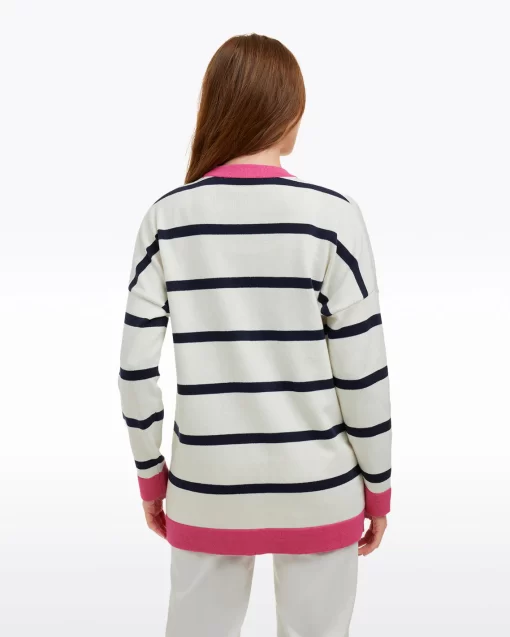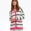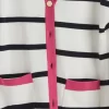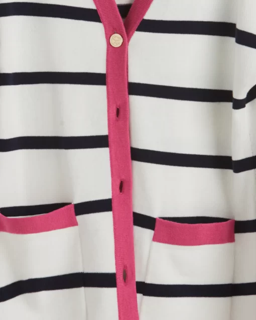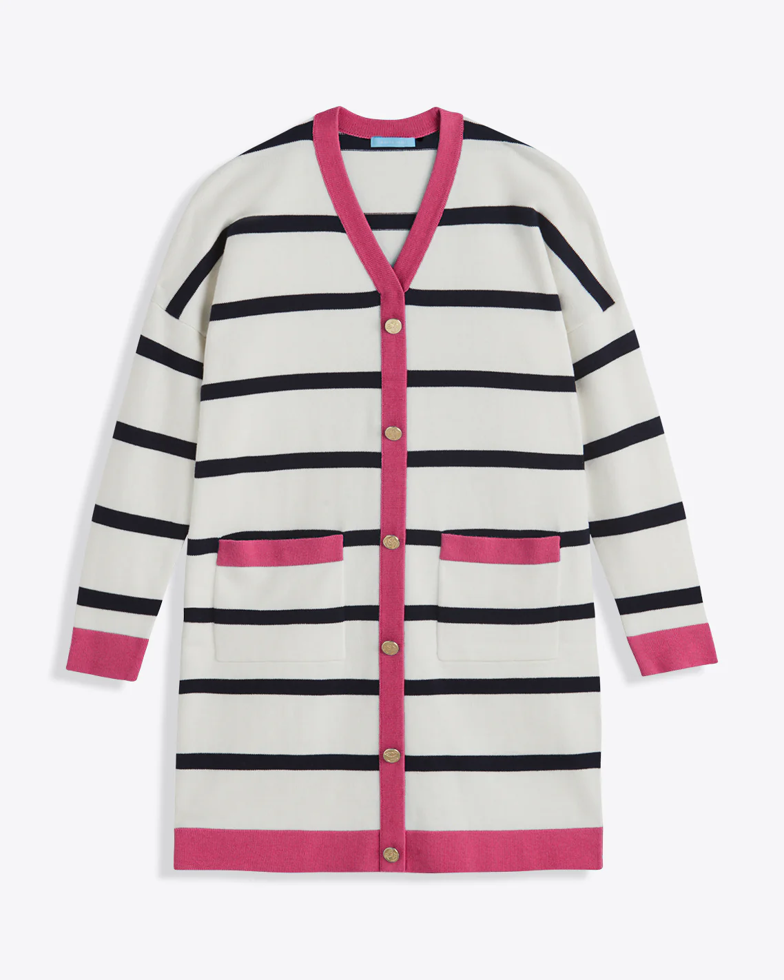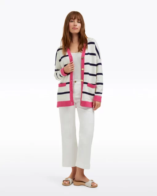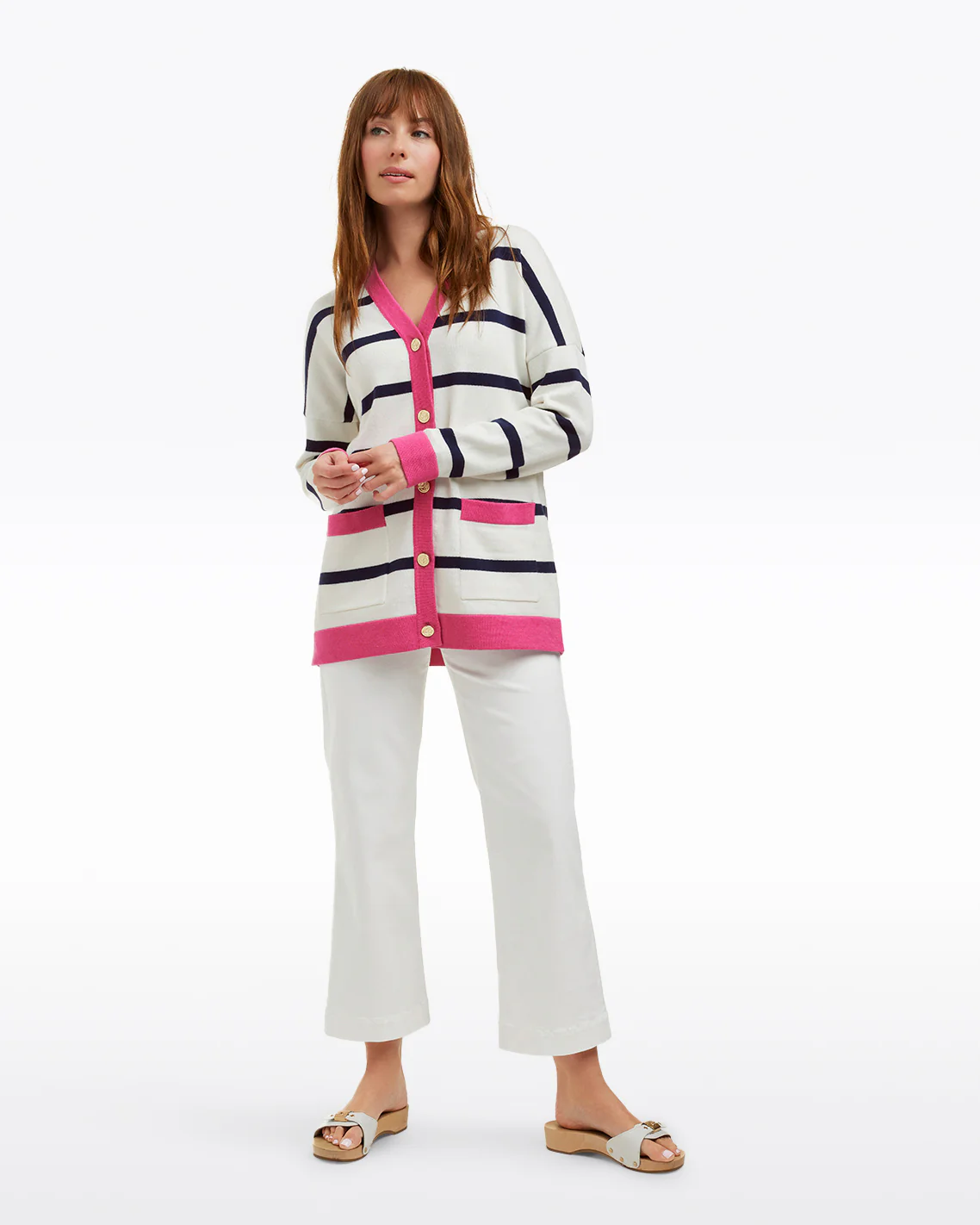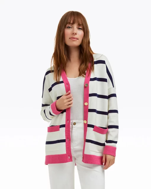 Show your stripes. Knit from a soft cotton-wool blend, Our Cassadee Cardigan is as comfy as it is chic. Finished with a V-shaped neckline, contrast-colored edges and patch pockets, it has a classic look that’s a perfect match for your favorite jeans or pants. Wear it to work, weekend gatherings, wherever!