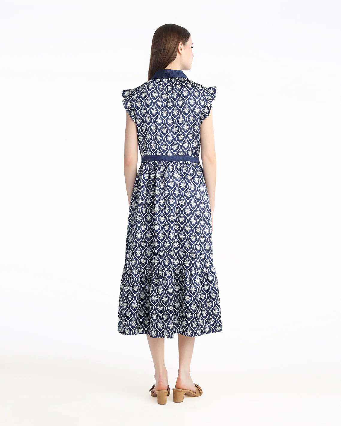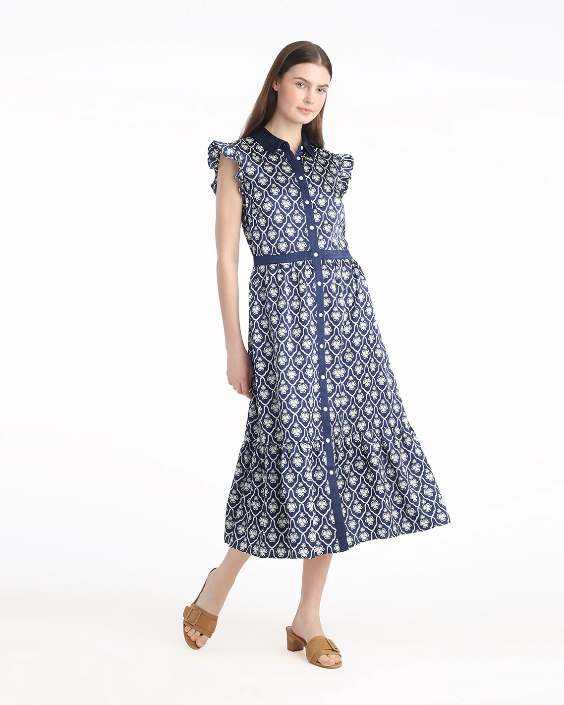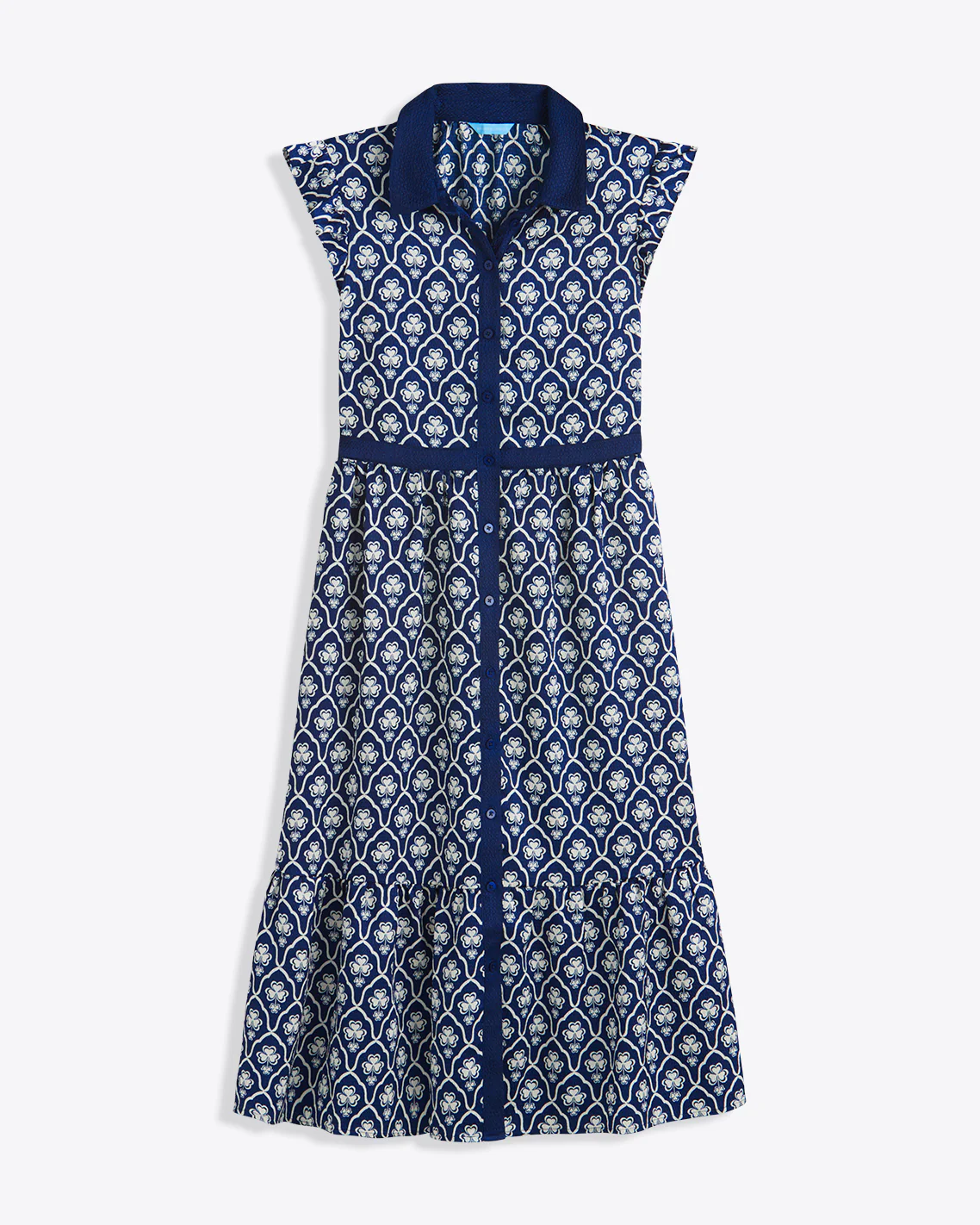 Button things up. Cut from printed hammered satin and finished with a contrasting collar and trim, our Emmylou Sleeveless Midi Shirtdress in Clover Field is a perfect, polished option for whatever you’re up to this season, from work meetings to weekend parties.