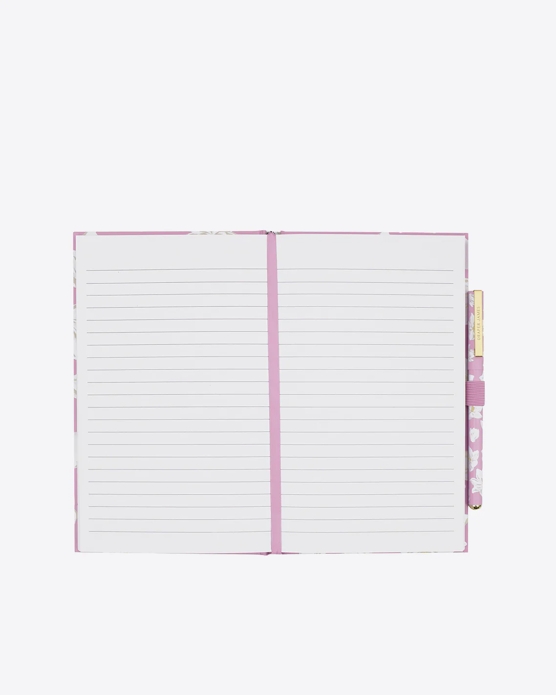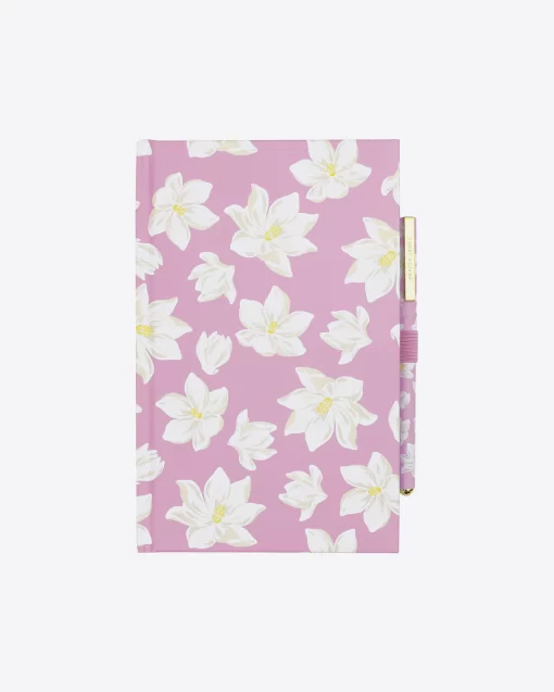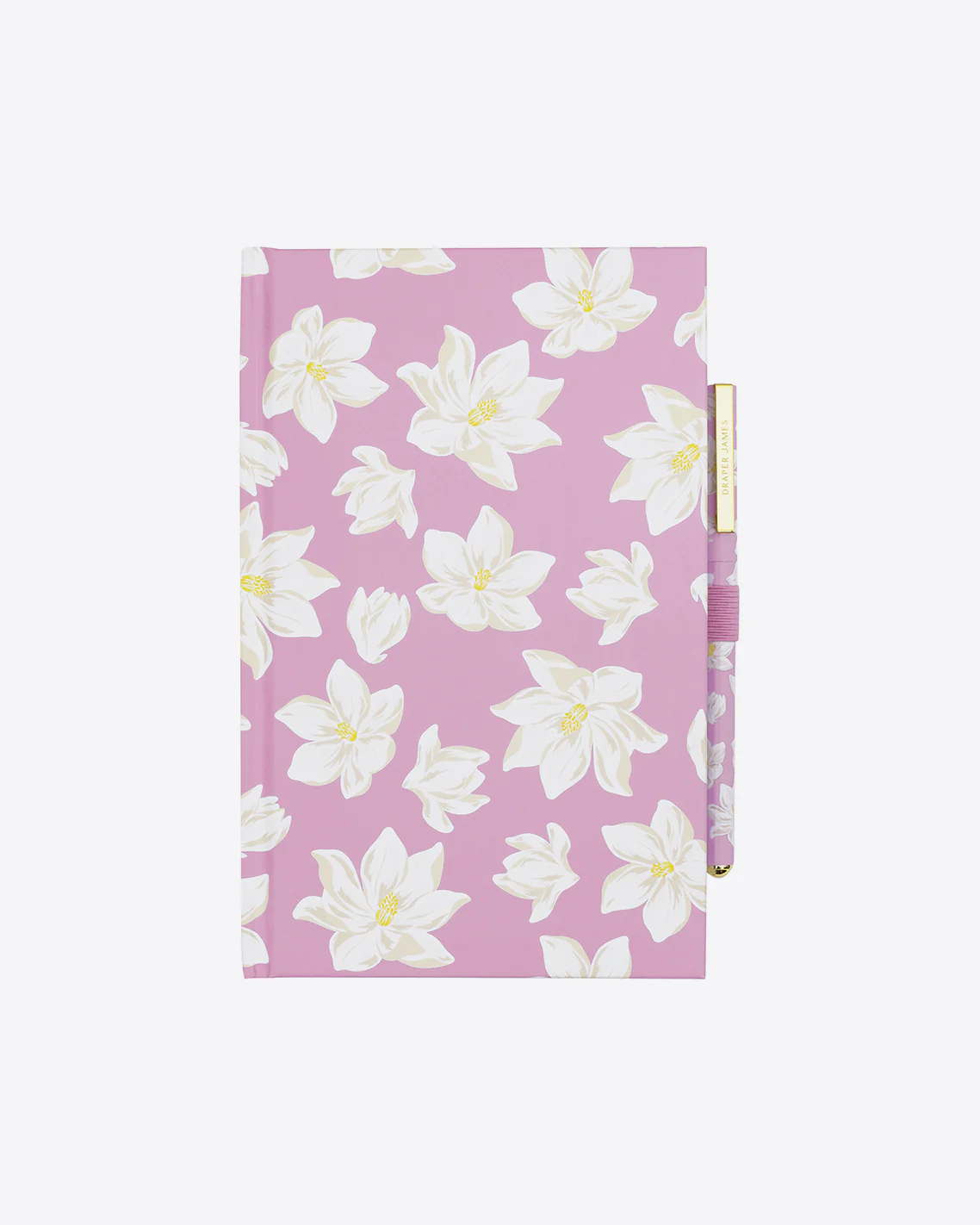 A match made in Heaven! This journal and pen set is the perfect duo to help you get all of those good ideas out on paper. Write journal entries, grocery lists, or your latest inspiration out with a black ink ballpoint pen featuring a cap with a gold engraved logo clip to attach to your notebook. The matching notebook sports the same cheery pink magnolia print and adds a touch of charm to your day.