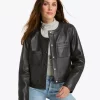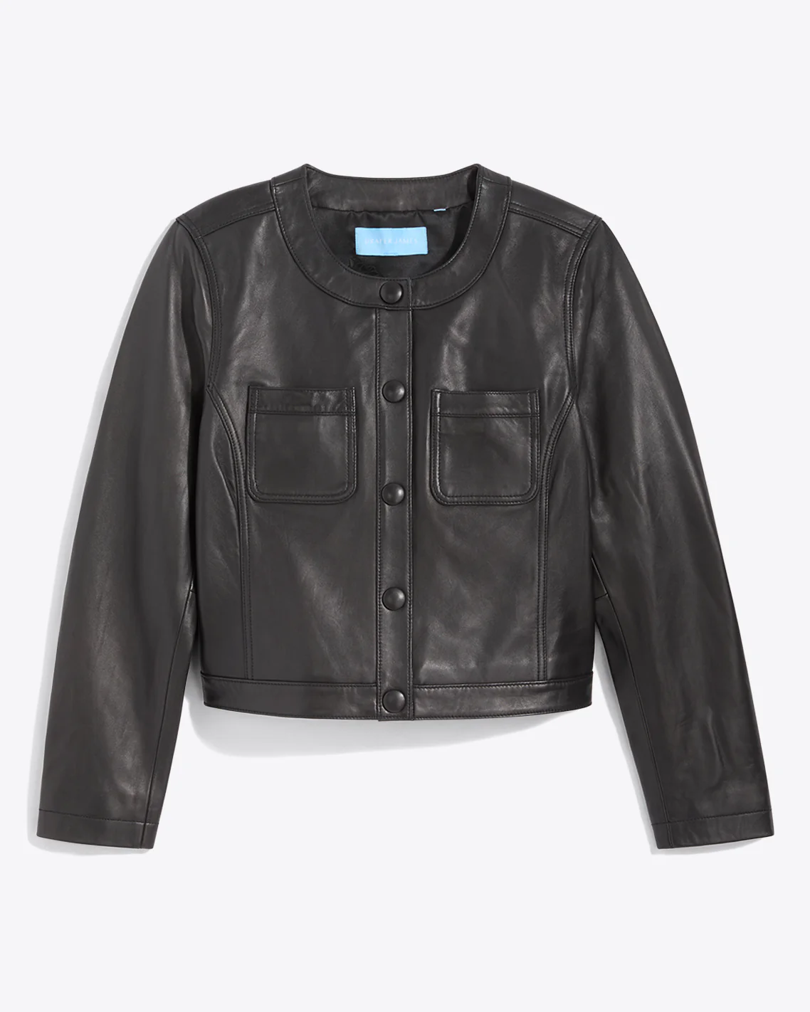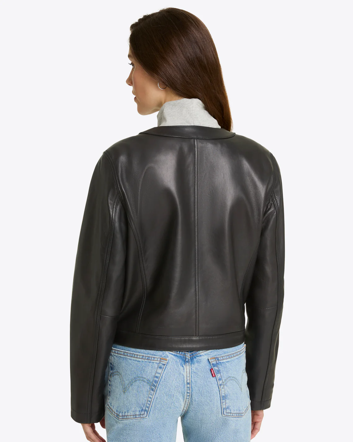 Lady like. Our Leather Collarless Jacket boasts a classic shape, albeit in a very cool material, so you can wear it pretty much anywhere. It’s a no-brainer with jeans and a T-shirt, but we love it over dresses, too, with a pair of boots.
