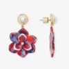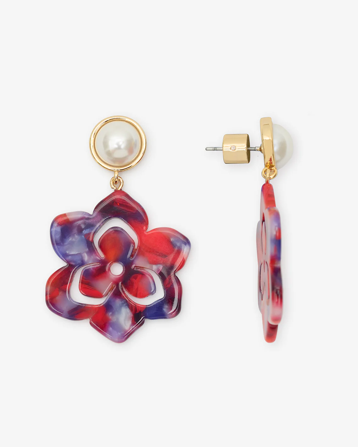 Petal pusher. Our Magnolia Drop Earrings—made from 10K gold-plated brass with a red, white and blue acetate flower dangling from a glass pearl stud—add a shot of color (and whimsy) to whatever you choose to wear them with.