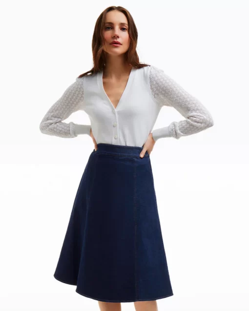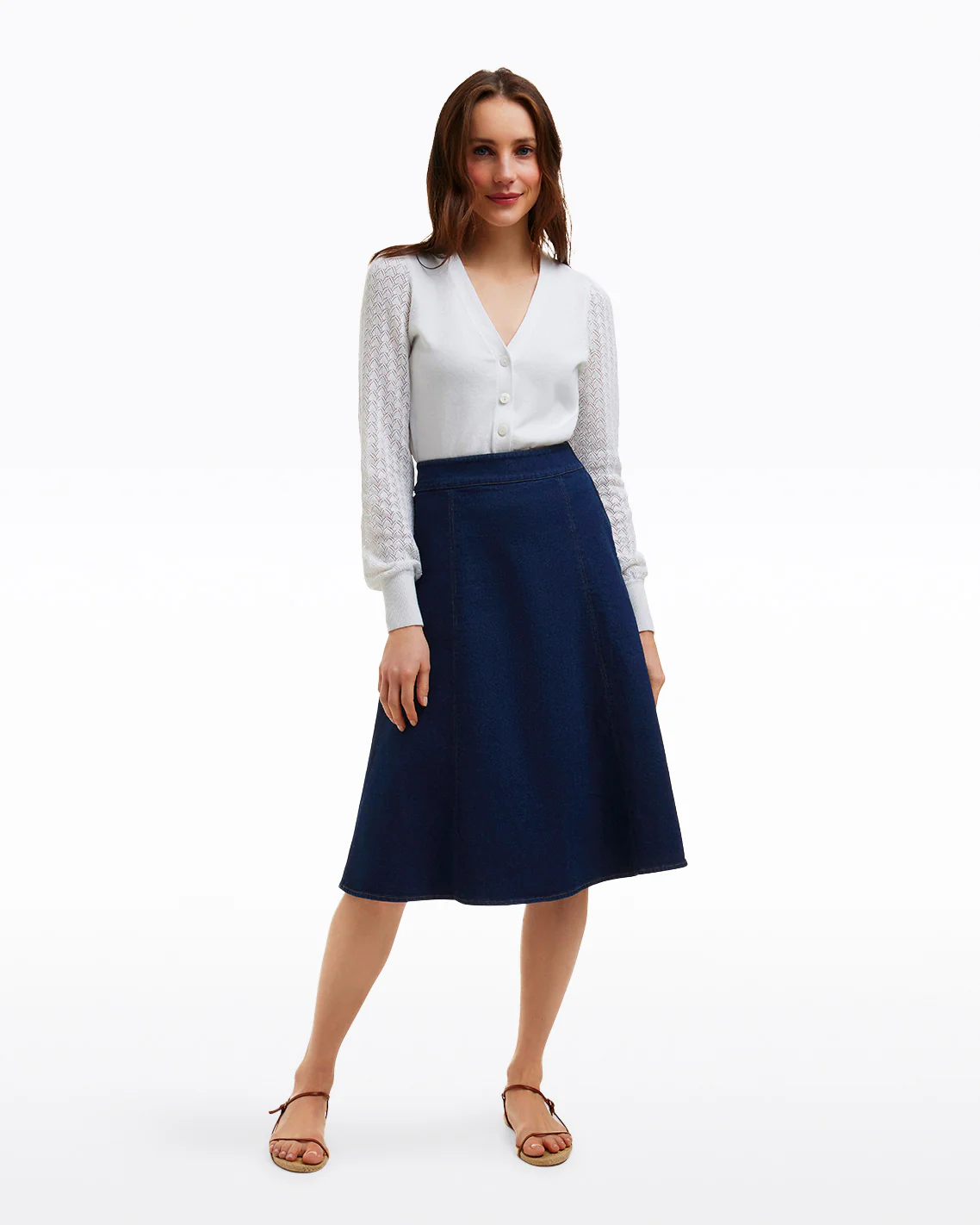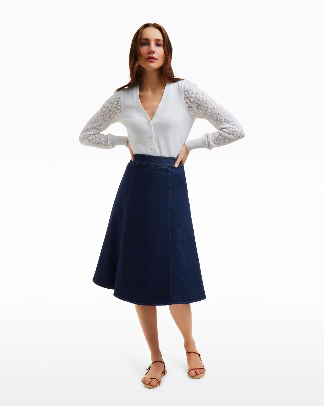 Skirt the issue. Cut from a soft cotton with the perfect amount of stretch, our Midi Skirt in Dark Wash Denim is a dressed-up alternative to your favorite pair of jeans. Wear it with a sweater, tights and boots for a perfect winter fit (and a T-shirt and clogs come spring!)