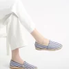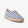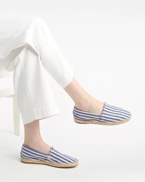 - Easy to wear slip-on shoe, in nautical stripe fabric with a raw edge finish, classic jute sole edge, rounded toe, and comfort sock padding.