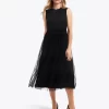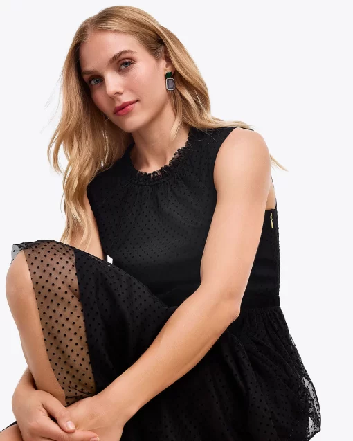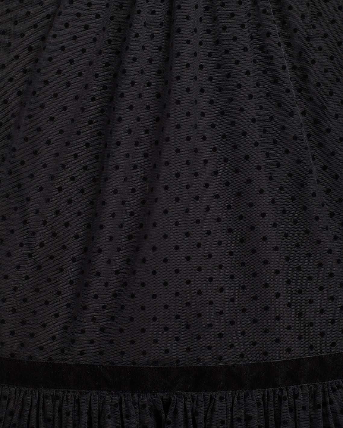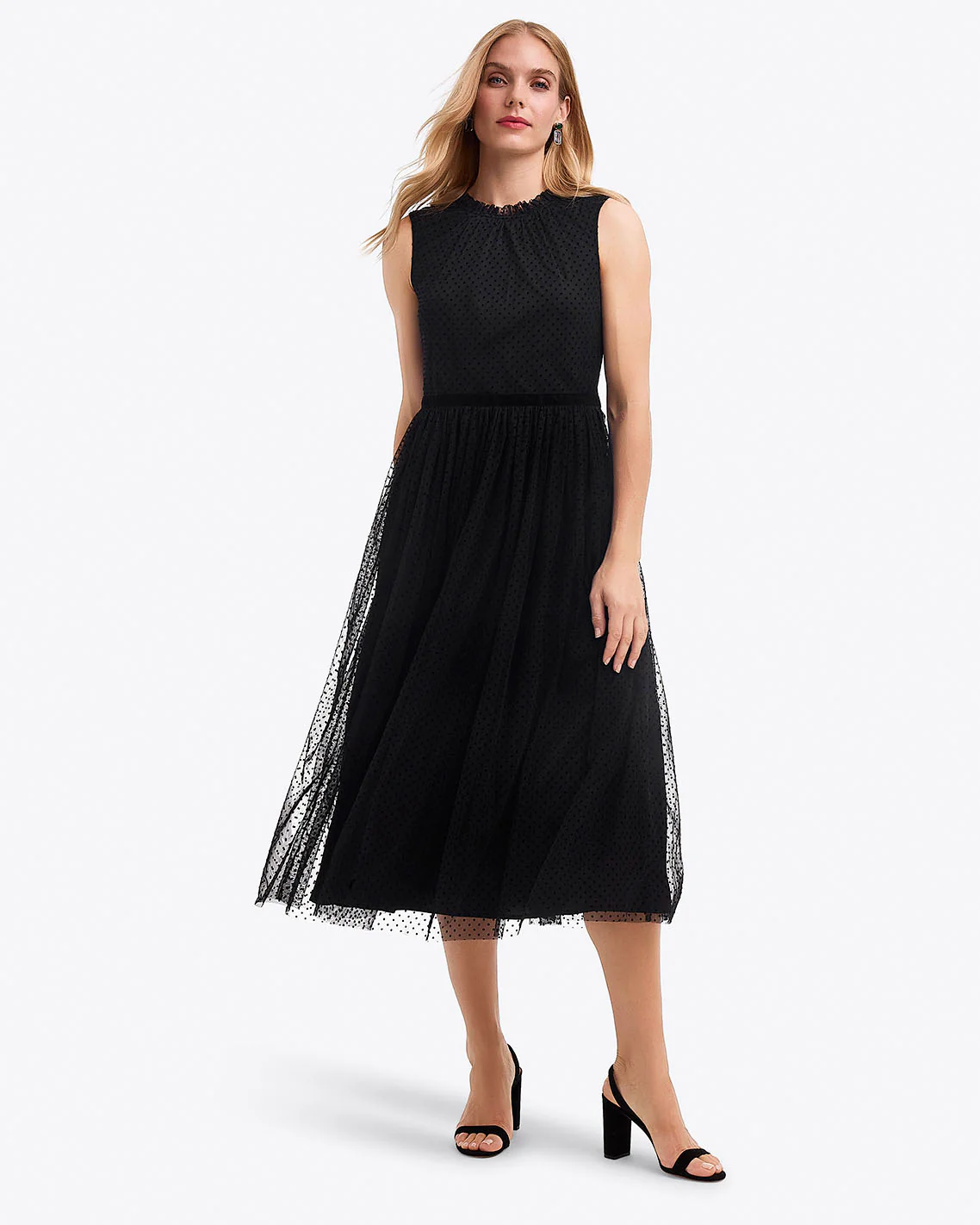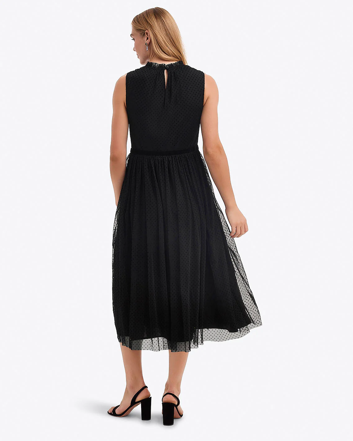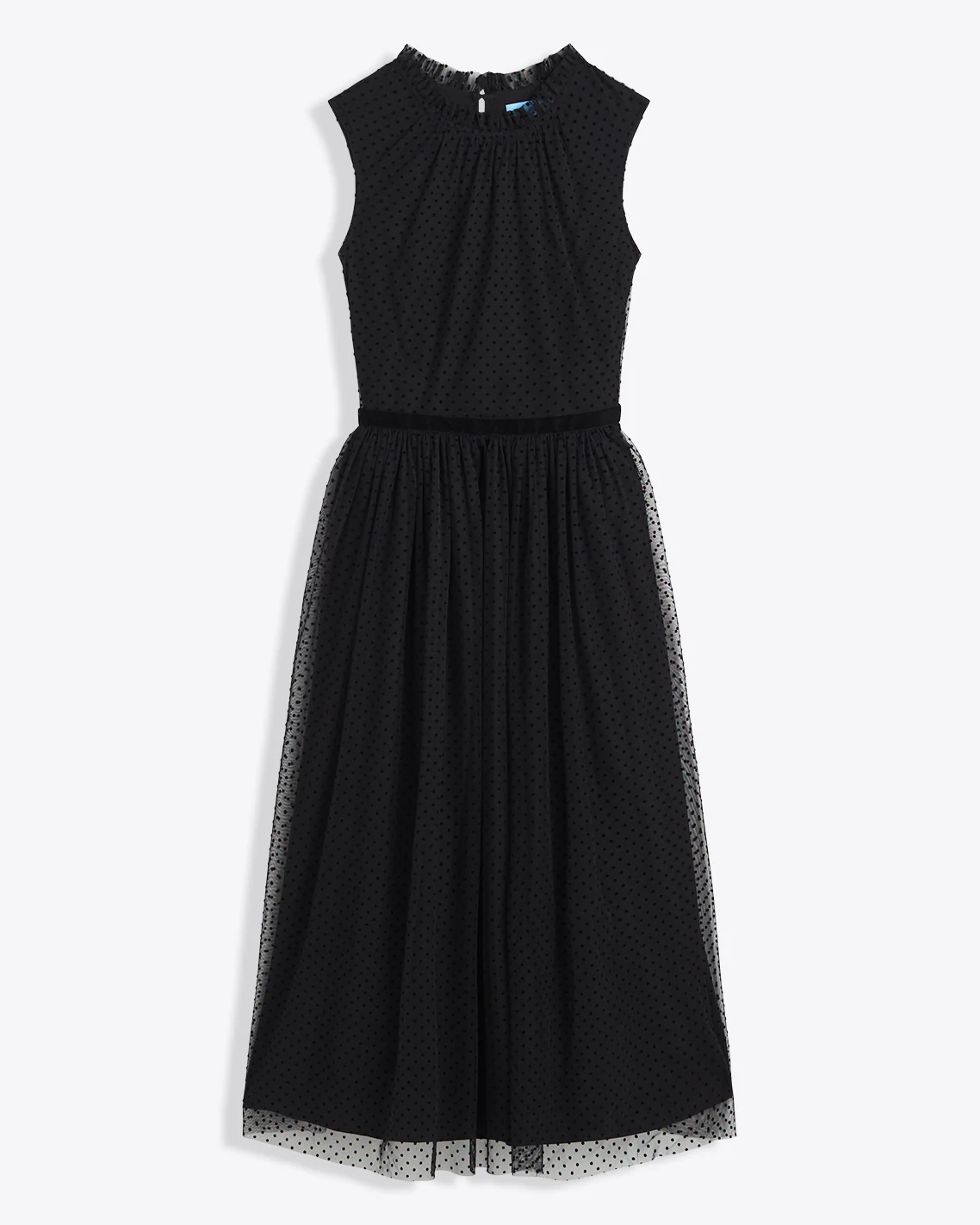Ready to party? Our Sleeveless Dress in Tulle certainly is. Cut from a polka-dotted tulle, fully lined and finished with a ruffled neckline and velvet ribbon at the waist, this is a perfect pick for holiday parties, dinner dates and weddings.